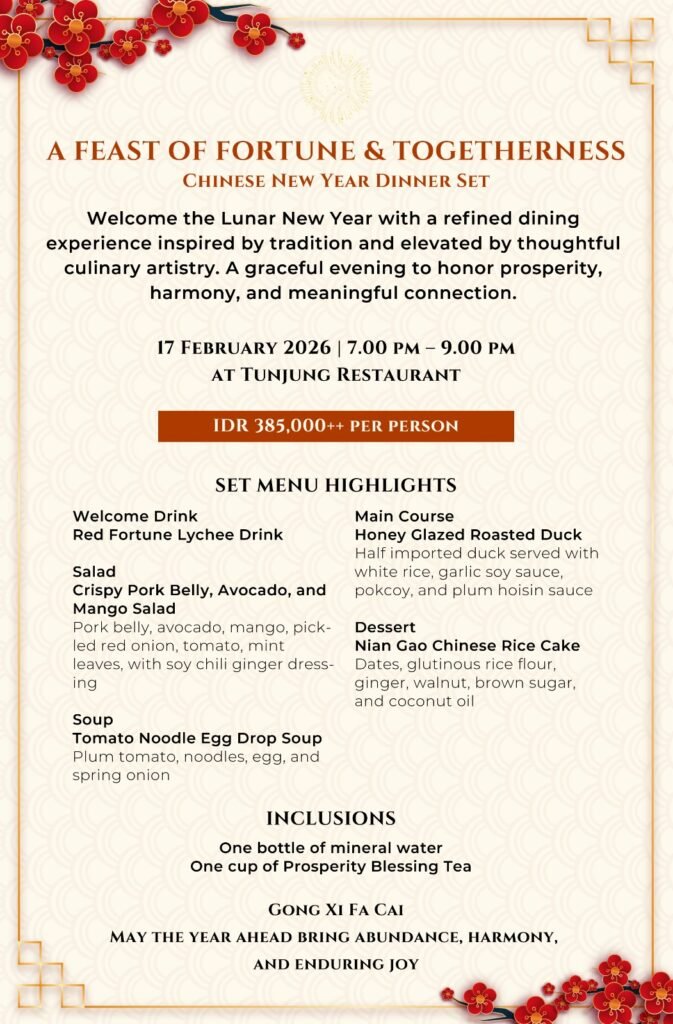 Surrounded by lush gardens and cool mountain air, Tunjung Restaurant offers a peaceful and elegant setting to welcome the Lunar New Year. This festive dinner is ideal for families, couples, and friends seeking a meaningful celebration away from the crowds.