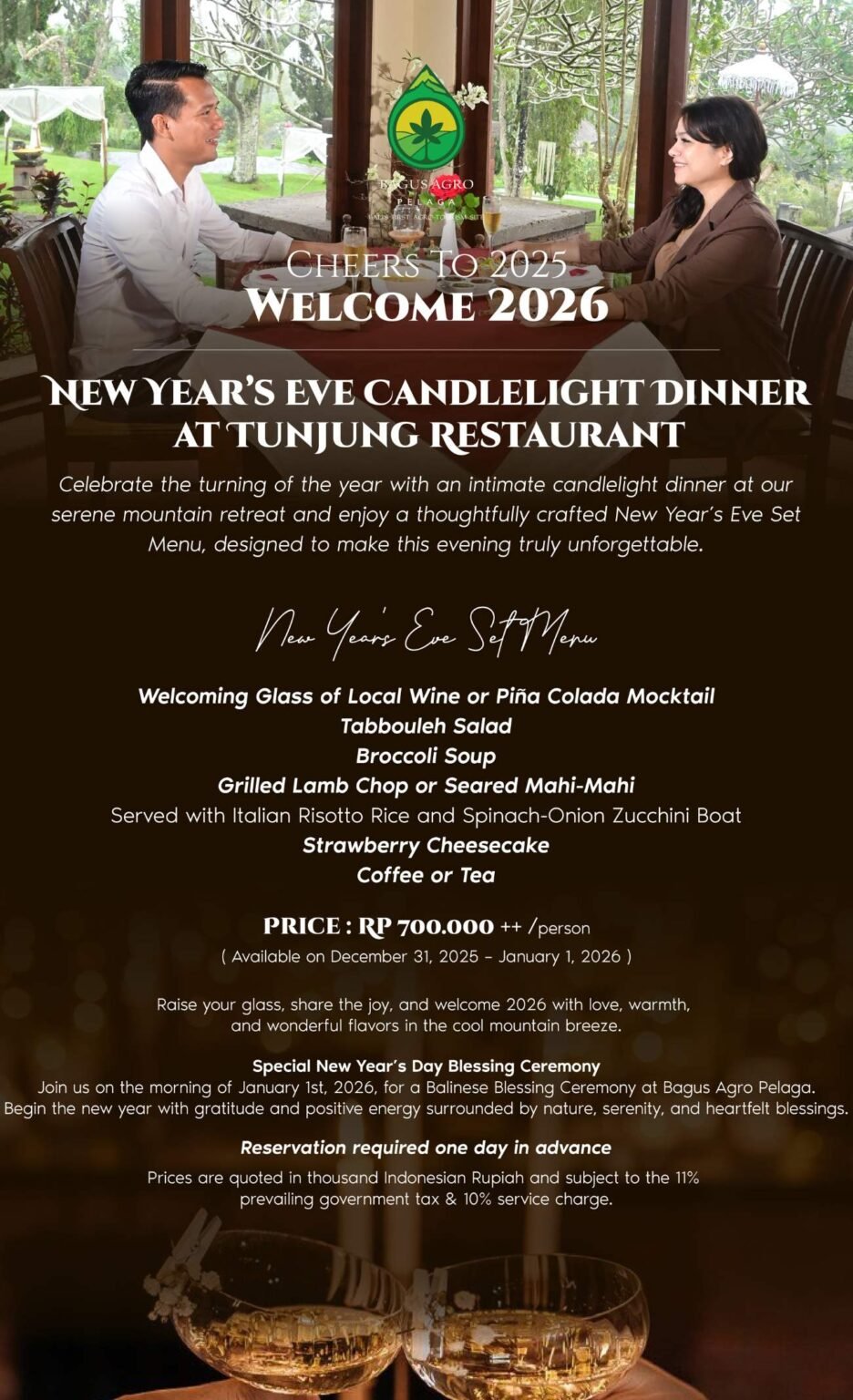 Set among orchards and vegetable gardens, Bagus Agro Pelaga blends festive warmth with highland tranquillity. Share the joy of Christmas (24–26 December 2025) at Lotus Restaurant, welcome the new year with an intimate Candlelight Dinner on 31 December 2025 (also available 1 January 2026) at Tunjung Restaurant, and greet the morning of 1 January with a heartfelt Balinese Blessing Ceremony surrounded by nature.